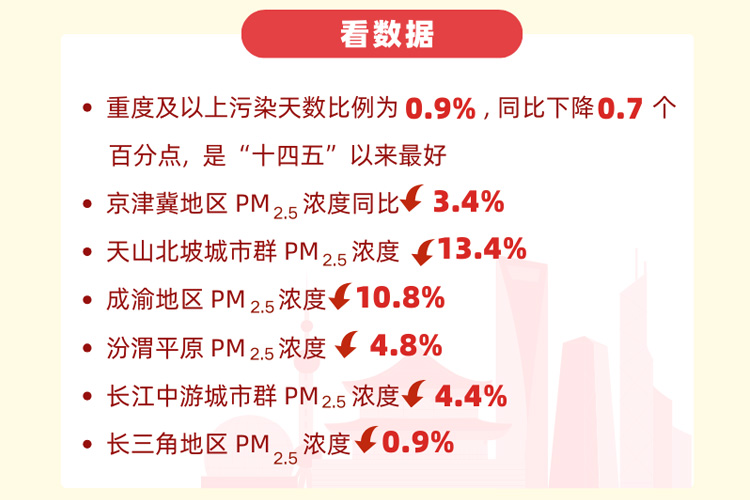 2025年政府工作報告指出,2024年生態(tài)環(huán)境質(zhì)量有新改善,地級及以上城市細(xì)顆粒物(PM2.5)濃度下降2.7%,優(yōu)良天數(shù)比例上升至87.2%。