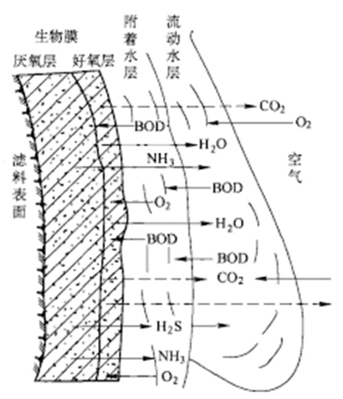 由于生物膜的吸附作用,在膜的表面存在一個(gè)很薄的附著水層。污水流過(guò)生物膜時(shí),有機(jī)物經(jīng)附著水層向膜內(nèi)擴(kuò)散。膜內(nèi)微生物在氧的參與下,對(duì)有機(jī)物進(jìn)行分解和機(jī)體新陳代謝。代謝產(chǎn)物沿底物相反的方向擴(kuò)散,從生物膜傳遞返回液相和空氣中。在整個(gè)生物膜系統(tǒng)中,微生物不斷吸收有機(jī)營(yíng)養(yǎng)成分,污水不斷得到凈化,而生物膜也不斷生長(zhǎng),一些老化的生物膜會(huì)自動(dòng)脫落,從而保持了生物膜的良好活性。